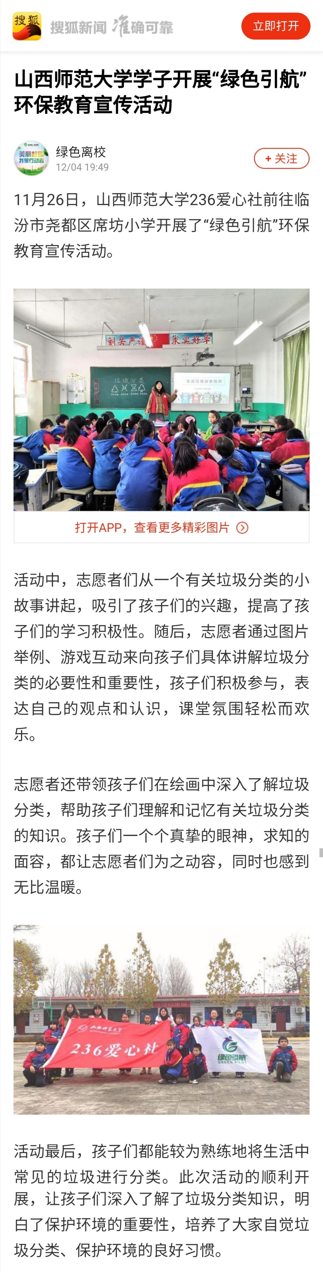 12月4日,搜狐新闻客户端以“mobile28365正规网址学子开展‘绿色引航’环保教育宣传活动”为题报道了公司236爱心社“绿色引航”环保教育宣传活动。