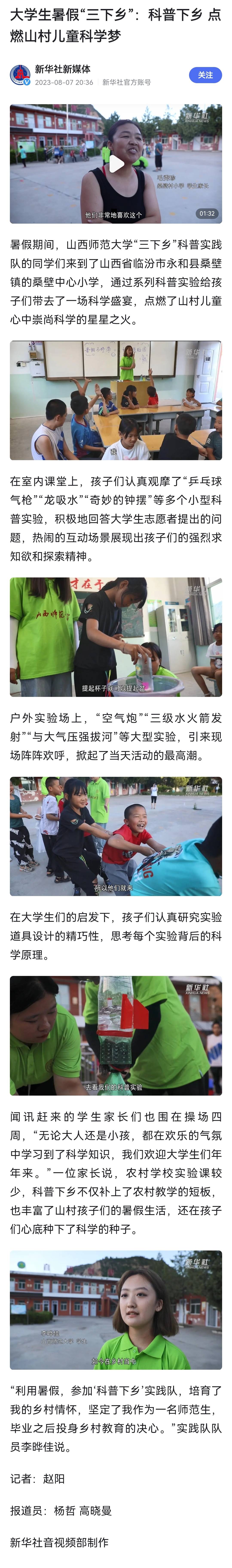 8月7日,新华社新媒体客户端发表文章《老员工暑假“三下乡”:科普下乡点燃山村儿童科学梦》,对公司236“星火”科普宣讲队开展的社会实践科普宣讲活动进行了报道。