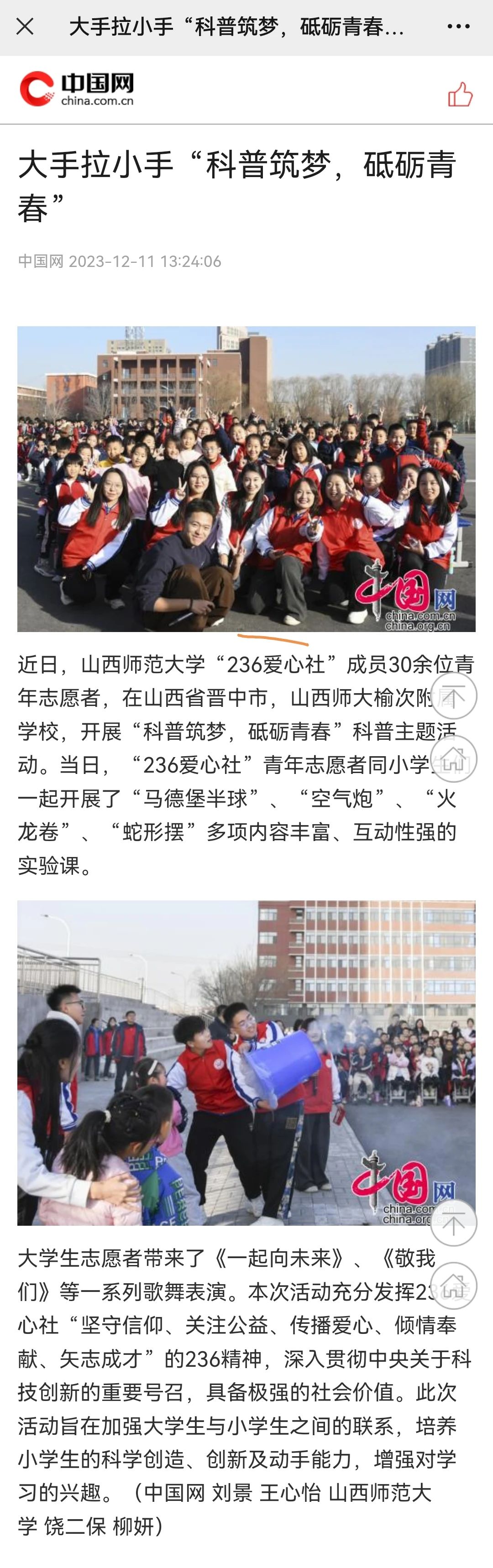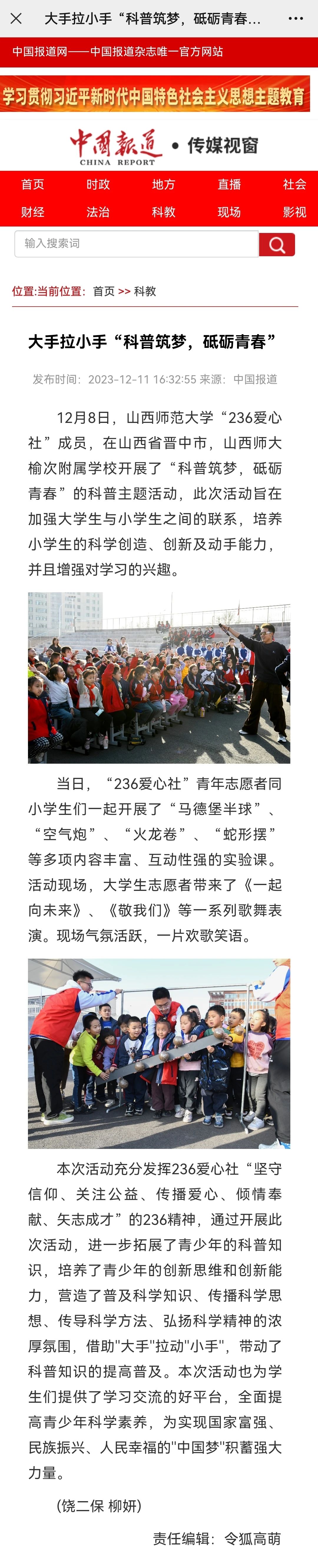 12月11日,《中国网》《中国报道网》以“大手拉小手'科普筑梦,砥砺青春'”为题,报道了公司236爱心社“科普筑梦,砥砺青春”科普主题活动。