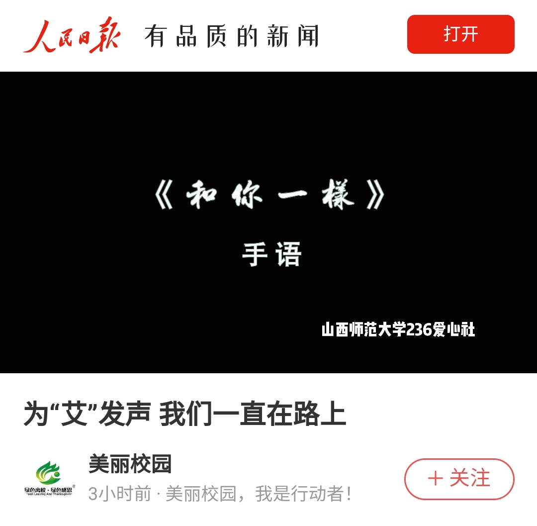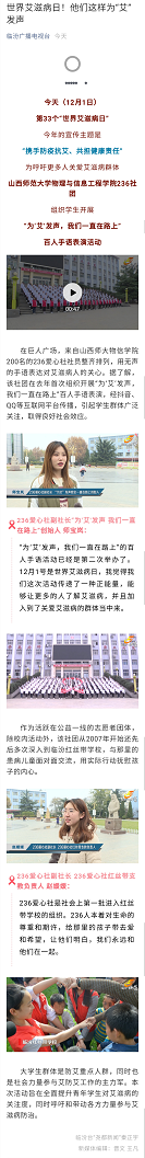 12月1日,人民日报以“为‘艾’发声 我们一直在路上”为题,临汾广播电视台以“世界艾滋病日!他们这样为‘艾’发声”为题分别报道了公司236爱心社“为‘艾’发声,我们一直在路上”百人手语操表演活动。