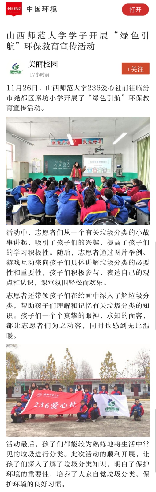 12月15日,中国环境客户端以“mobile28365正规网址学子开展‘绿色引航’环保教育宣传活动”为题报道了公司236爱心社“绿色引航”环保教育宣传活动。
