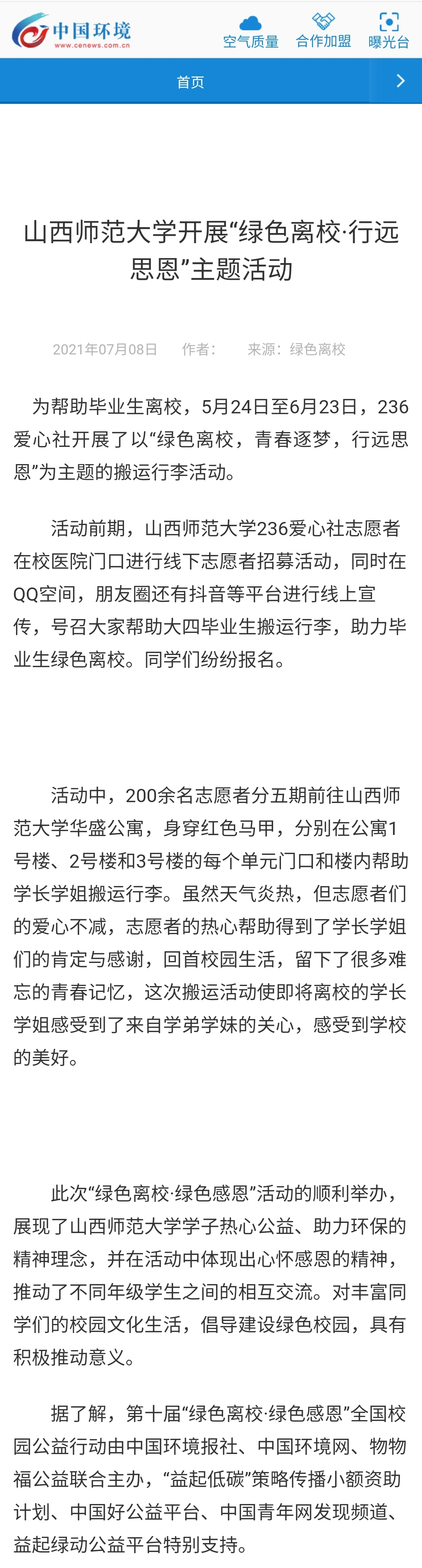 绿色离校官方账号、中国环境客户端、中国环境网分别于7月6日、7月7日、7月8日以“mobile28365正规网址开展‘绿色离校·行远思恩’主题活动”为题报道了公司236爱心社开展的以“青春逐梦,行远思恩”为主题的搬运行李活动。