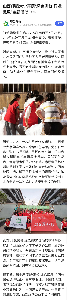 绿色离校官方账号、中国环境客户端、中国环境网报道公司236爱心社“青春逐梦,行远思恩”主题活动