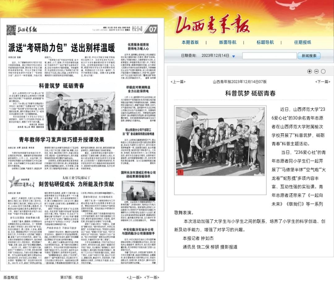 12月14日,《山西青年报》以“科普筑梦,砥砺青春”为题,报道了公司236爱心社“科普筑梦,砥砺青春”科普主题活动。