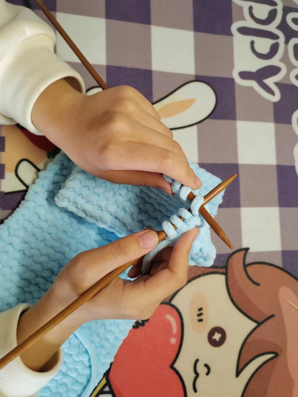 这次我有幸参加了“为爱穿针,以织传情”的活动,对于这次的经历,我感触颇深。我在之前从未接触过织围巾,而且听说是给山区孩子织围巾,所以便想要去尝试尝试。一共参加了两次培训,学姐们都非常的热情,手把手教我们如何去起针,如何织第二排,如何收尾,即使我做错了,学姐也会温柔耐心的教我。在不断的练习后,我终于学会了,很开心。然后便与我的另外两个舍友一起织围巾给山区的孩子。当一条蓝色的围巾出现在我面前时,是满满的成就感。