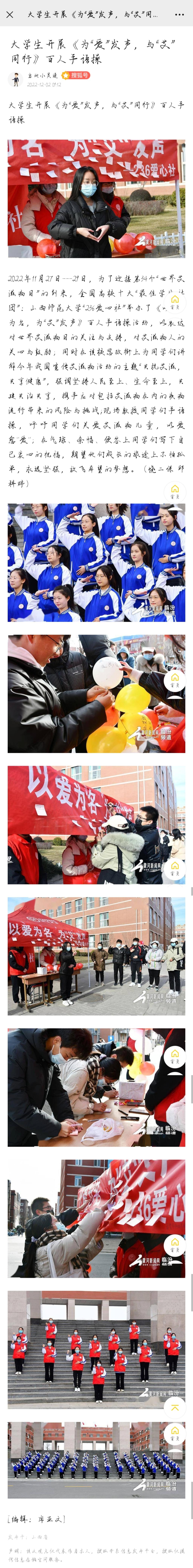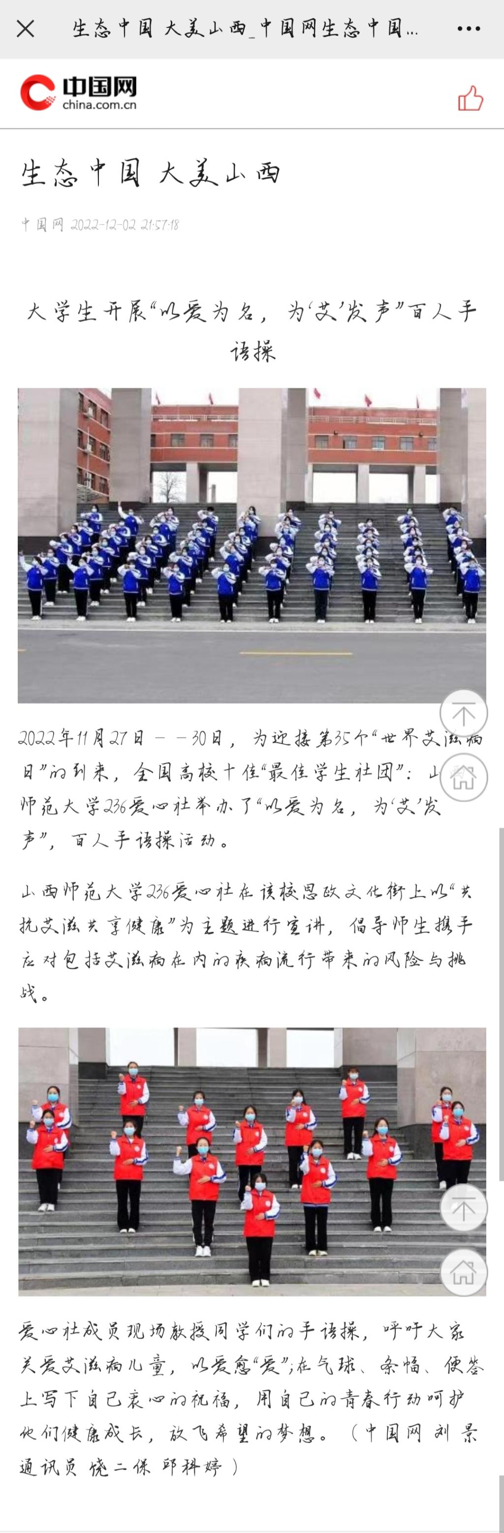 12月2日,中国网、黄河新闻网临汾报道频道分别以“老员工开展“以爱为名,为‘艾’发声”百人手语操”、“老员工开展《为“爱”发声,与“艾”同行》百人手语操”为题,报道了公司236爱心社“为‘爱’发声,与‘艾’同行”百人手语操活动。
