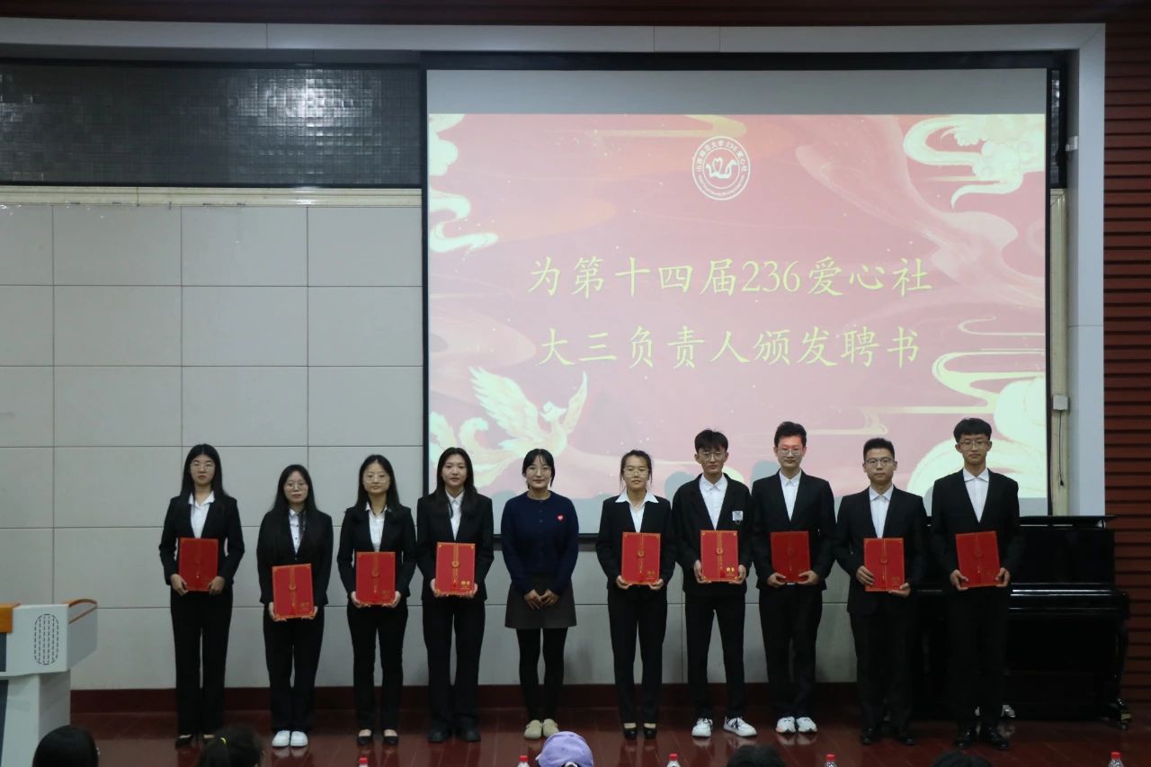 会上,大家共同观看了236爱心社历任社长寄语。她们表示,236爱心社十几年来关注公益、传播爱心,将温暖传递到了全国各地。作为236爱心社成员,同学们要传承好“坚守信仰,关注公益,传播爱心,倾情奉献,矢志成才”的236精神,走好新一届236人的道路,开启公益新模式,开拓发展新方向。