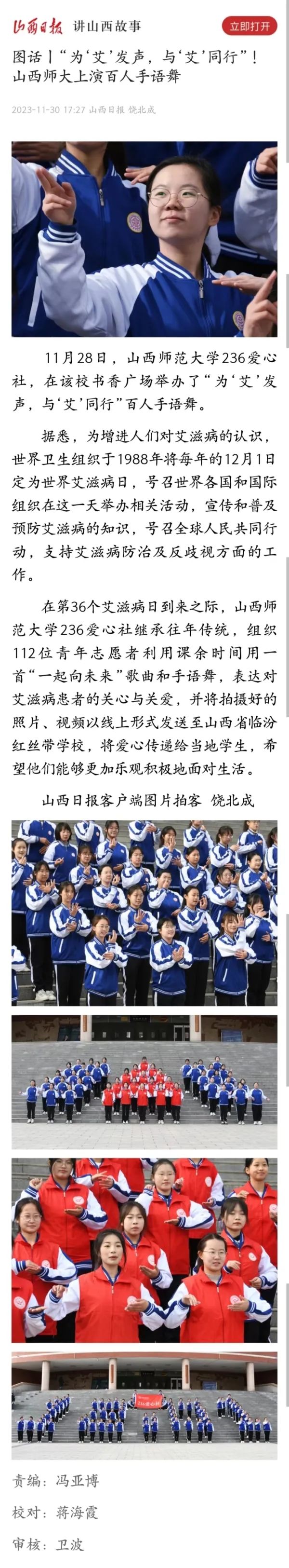 11月30日,《山西日报》客户端以《“为‘艾’发声,与‘艾’同行”!山西师大上演百人手语舞》为题,报道了公司236爱心社“为‘艾’发声,与‘艾’同行”百人手语舞活动。