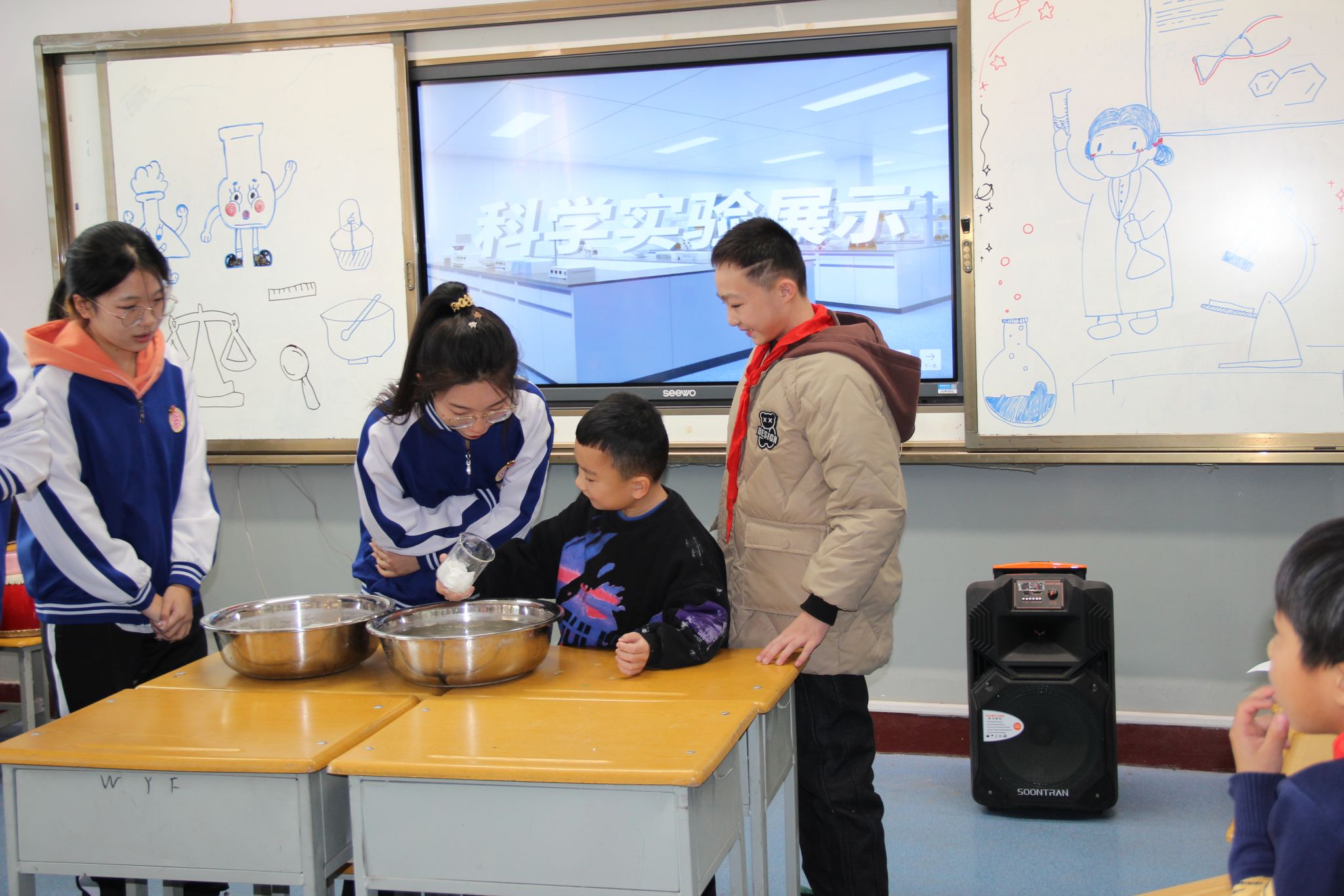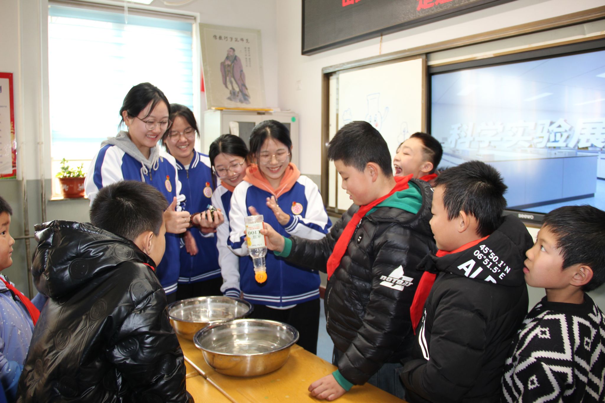 科普宣讲第二天,实践队员们用常见的蜡烛、塑料瓶、乒乓球、白醋、小苏打等生活用品,为孩子们展示了“无字天书”“不会湿的纸巾、水吸乒乓球”“火山喷发”等一系列简单有趣的物理实验。
