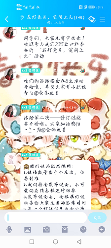 活动前期,妙趣横生的线上宣传吸引了同学们的热情参与。元宵节当天,同学们共同观看了“灯火通明元宵节”系列视频,并通过填写问卷的形式,了解了“上元节”的“前世今生”,以及多姿多彩的节日文化。花灯上元夜,工作人员在活动群中开展了益智欢乐的猜灯谜小活动,同学们开动脑筋,踊跃猜谜,在元宵节传统活动中感受到了中华语言与文化的魅力。