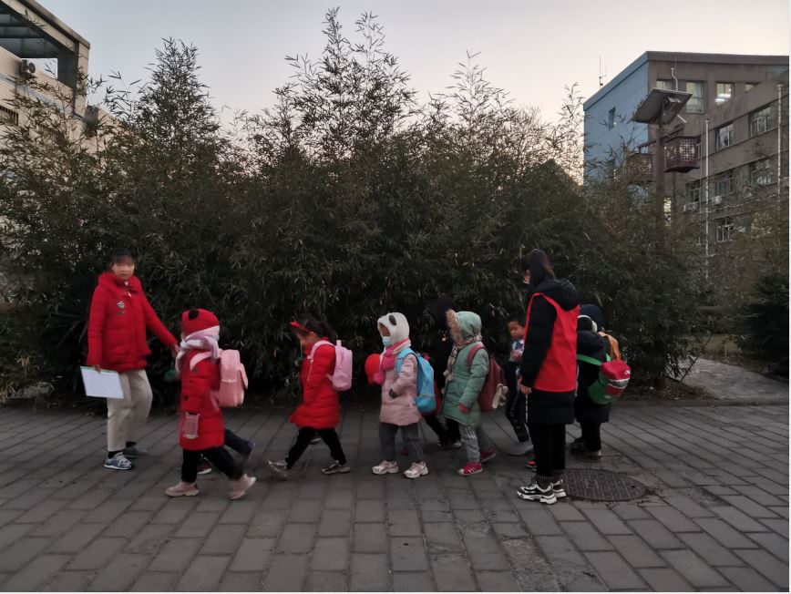 受疫情影响,师大幼儿园在本学期实行了幼儿错峰入园以及老师在校园门口接送的规定,由于路程较长,幼儿较多,因而接送工作成了幼儿园面临的一大难题。在了解了这个情况后,236爱心社于9月14日至12月31日开展了长达三个多月的幼儿园接送服务活动。