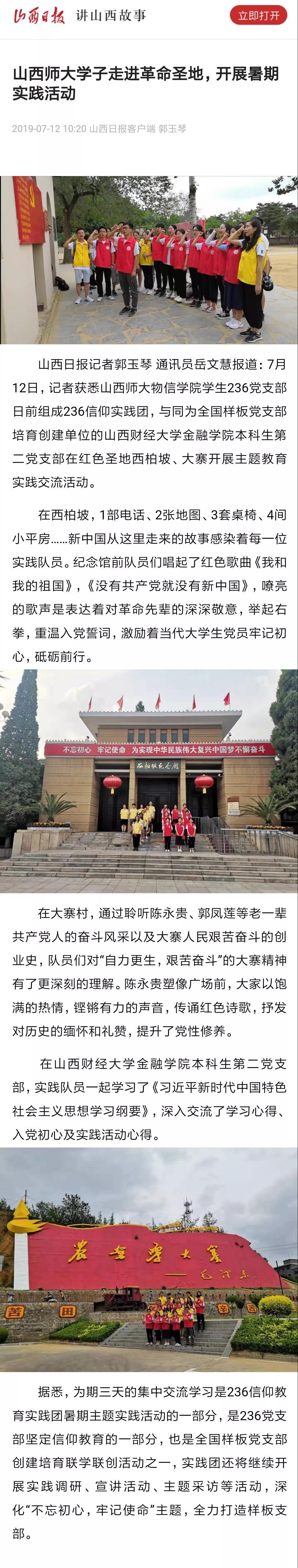2019年7月12日,山西日报以“山西师大学子走进革命圣地,开展暑期实践活动”为题,报道了公司员工236党支部信仰教育主题教育实践交流活动。