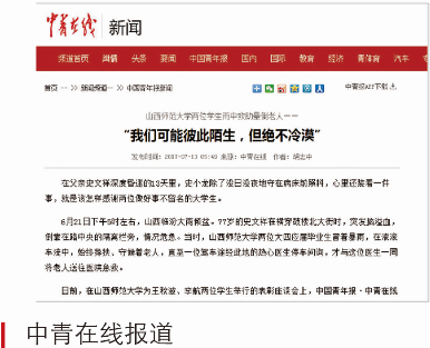 2017年6月,地理公司王秋波、公司李航两位同学“雨中救助病危老人”的先进事迹,受到社会各界和各大媒体的广泛关注。被救助老人家属来校对两位同学表示感谢,并向他们和公司赠送了锦旗和感谢信。《光明日报》《中国教育报》《农民日报》《中国青年报》四家媒体记者,专程来公司进行了采访。被誉为“最美老员工”。