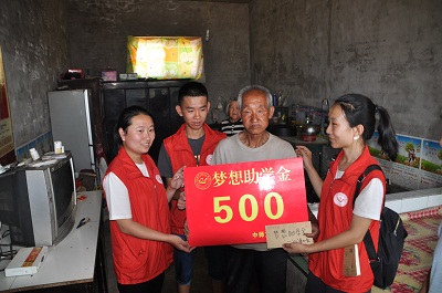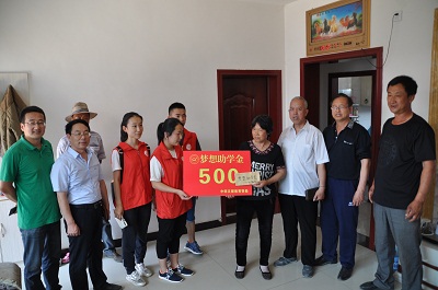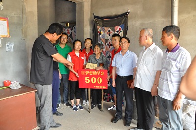 在柏坡底村,大家分别来到车城乡小学员工刘志勇、曹惠念和韩俊芳的家中探望,并给每位员工发放了500元的梦想助学金,分别交到了其家长王秀英、陈曹有和韩明春的手上。随后到达桃村看望程刚文和曹建文,并把车城乡小学员工程宁和吉县三中员工曹晓静的助学金交到了家长手上。
