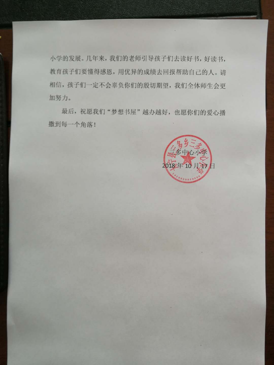 10月17日是第5个全国扶贫日,公司236党支部和236爱心社收到了一封特殊的回信,236第三座“梦想书屋”所在地大宁县三多中心小学的全体师生回信表达了他们对236精准教育扶贫工作的致谢。大宁县三多中心小学“梦想书屋”建立于2014年的5月13日,距离至今整整过去了四年的时间。当年,236响应习近平总书记在2013年11月湖南湘西考察时首次作出的“实事求是、因地制宜、分类指导、精准扶贫”重要指示精神和2014年3月参加两会代表团审议时强调“要实施精准扶贫,瞄准扶贫对象,进行重点施策”的“精准扶贫”号召,迅速行动,在国家级贫困县大宁县选择了三多中心小学进行精准教育扶贫,捐建了236的第三座“梦想书屋”,为那里的孩子们送去了书本、送去了知识、送去了温暖、也送去了希望。“梦想书屋”项目是236志愿服务的12个品牌特色项目之一,每座书屋配置1500—2000册图书,致力于为贫困山区条件较弱的中小学提供教育帮扶。
